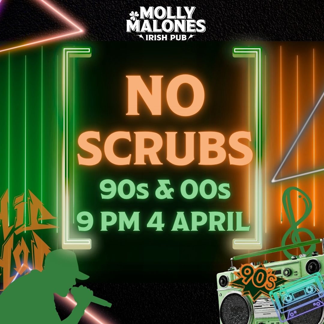 NO SCRUBS hits Molly Malone’s on Saturday 4 April from 9PM.DJ Nufe spins the best 90s & 00s Hip‑Hop and R&B throwbacks, bringing familiar classics, great energy and a fun local atmosphere.